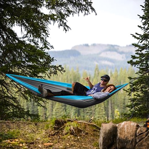 Super behagelig hængekøje, der kan rumme to personer, der ligger ved siden af hinanden! Lavet af forstærket nylon til at holde over 200 kg på samme tid! Sammen tager det næsten ingen plads overhovedet, hvilket gør det perfekt til at tage alt fra camping, bådture, stranden eller skovvandringen!